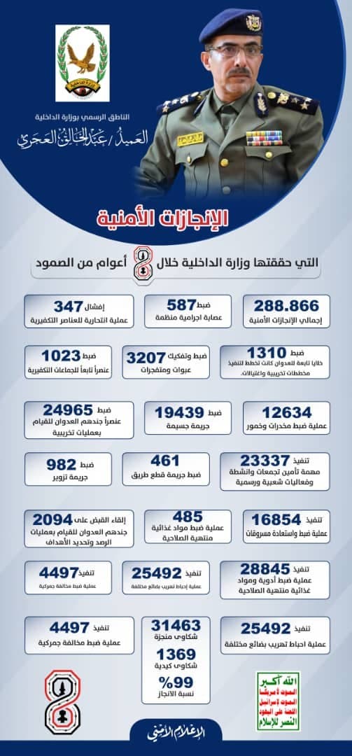 اخبار اليمنانفو جرافيك .. الانجازات الأمنية لوزارة الداخلية خلال 8 اعوام من الصمود وزير الدفاع: مضطرون إلى اعتماد معادلة الميناء بالميناء إن اقتضت الضرورة لفك الحصار بريطانيا تتعهد بنقل سلاح يحوي يورانيوم مخصب إلى أوكرانيا