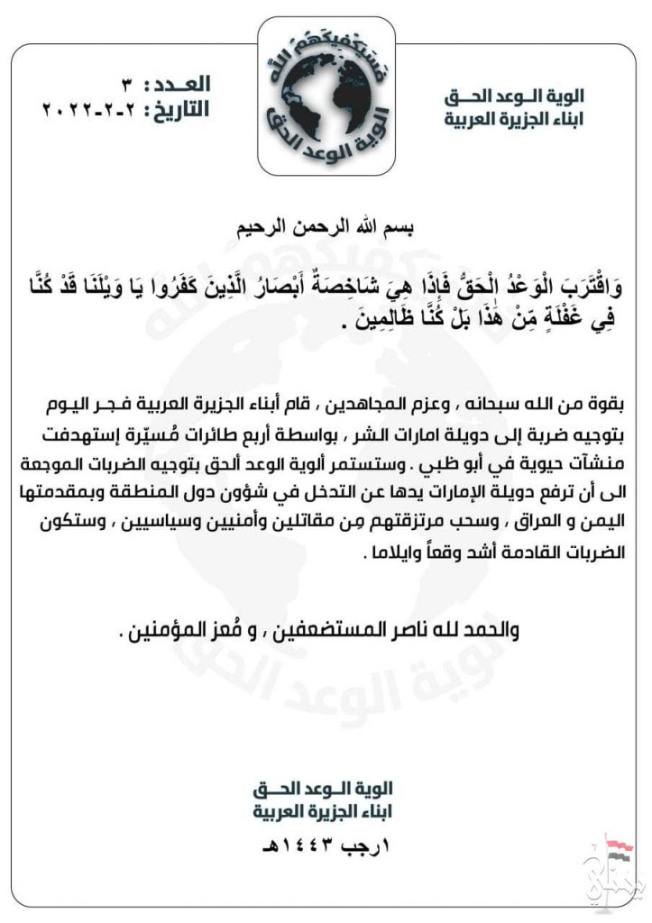 وبحسب مصادر فقد وجّهت “ألوية الوعد الحق” أبناءَ الجزيرة العربية، فجر اليوم الأربعاء، ضربة عسكرية لدويلة الإمارات العربية بواسطة أربع طائرات مسيرة استهدفت منشآت حيوية في أبو ظبي, جاء ذلك في بيان نشرته قبل قليل.
