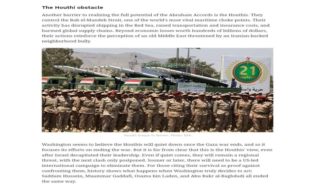 وفي جزئية من التقرير بعنوان “العقبة اليمنية” أو ما أسمتها الصحيفة “العقبة الحوثية”، قالت “إسرائيل هيوم”: “يُشكّل (اليمنيون) عائقًا آخر أمام تحقيق كامل إمكانات اتفاقيات إبراهيم”.
