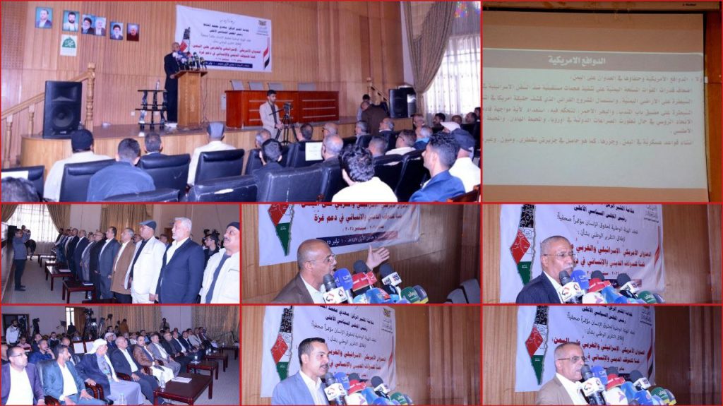 وفي المؤتمر الصحفي، استعرض المستشار القانوني لوزارة العدل وحقوق الإنسان حميد الرفيق، التقرير الوطني بشأن العدوان الأمريكي الإسرائيلي الغربي على اليمن، خلال الفترة من يناير 2024 وحتى سبتمبر 2025م، نتيجة للموقف الديني والإنساني في دعم الشعب الفلسطيني في قطاع غزة.