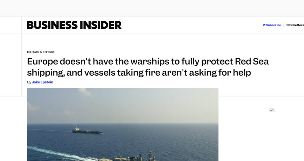 قالت صحيفة “بيزنس إنسايدر” إن أوروبا باتت عاجزة فعليًا عن حماية خطوط الملاحة في البحر الأحمر، معترفة بفشل مهمة “أسبيدس” التي يقودها الاتحاد الأوروبي في التصدي لهجمات القوات البحرية اليمنية. ووفقًا لتصريحات الأدميرال البحري فاسيليوس جريباريس،
