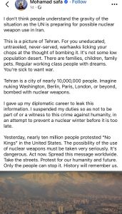 وقال محمد صفا عبر حسابه الرسمي: “لقد تخليت عن مسيرتي الدبلوماسية لتسريب هذه المعلومات علّقت مهامي حتى لا أكون جزءًا منها أو شاهدًا على هذه الجريمة ضد الإنسانية، في محاولة لمنع شتاء نووي قبل فوات الأوان”.