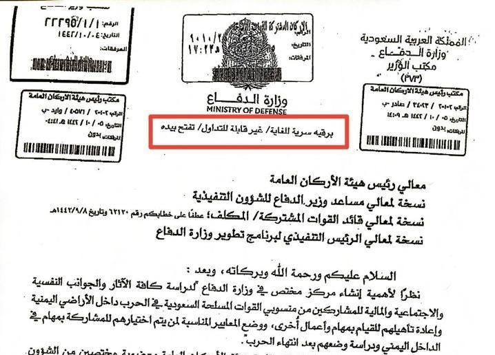 وتداول الناشطون السعوديون وثائق منسوبة لوزارة الدفاع السعودية تكشف توجه الوزارة عن دراسة انشاء مركز لرعاية الأحوال النفسية للعسكريين الذين شاركوا في الحرب باليمن.