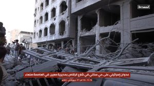 مشاهد أولية من استهداف العدو الإسرائيلي حي سكني في شارع الرقاص بمديرية معين في العاصمة صنعاء